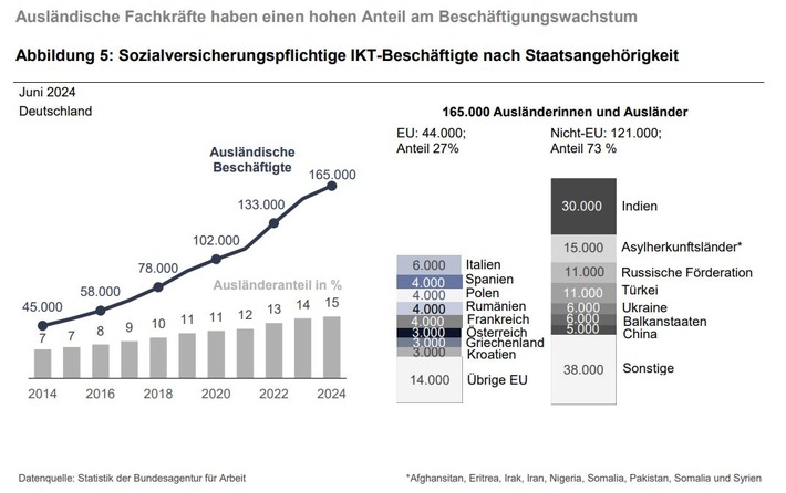 Der Zuwachs ist vor allem auf die sozialversicherungspflichtige Beschäftigung zurückzuführen, die seit 2014 um 70 Prozent (+463.000 Personen) anstieg. Dabei haben ausländische Fachkräfte einen relevanten Anteil am Wachstum: 2024 hatten 165.000 IKT-Fachkräfte keine deutsche Staatsangehörigkeit. Das sind 15 Prozent aller sozialversicherungspflichtig Beschäftigten in IKT-Berufen. Im Vergleich zu 2014 (45.000 Personen) hat sich die Zahl von ausländischen Beschäftigten hier gut verdreifacht. Der größte Zuwachs war bei Beschäftigten aus Indien, den acht zugangsstärksten Asyl-Herkunftsländern, Russland, der Türkei und der Ukraine zu verzeichnen. Unter den ausländischen IKT-Fachkräften hatten 2024 insgesamt rund 15.000 die Staatsangehörigkeit eines der zugangsstärksten Herkunftsländer von Asylbewerberinnen und Asylbewerbern. Der Großteil kam aus dem Iran (5.000), Pakistan (4.000) und Syrien (3.000).