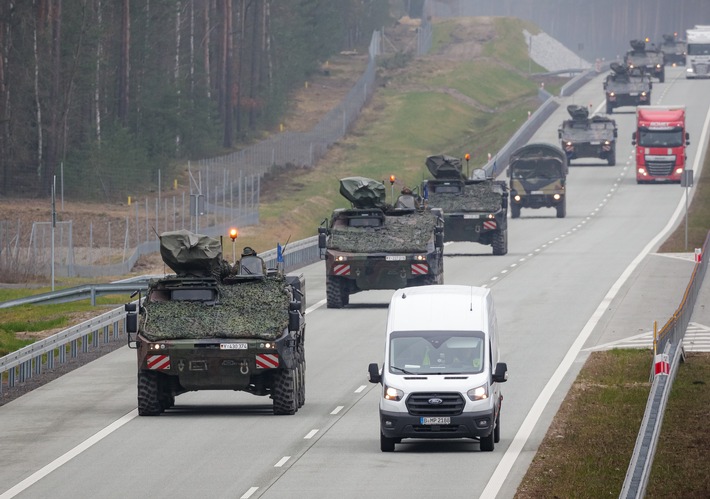 Aufgrund des stärkeren militärischen Verkehrsaufkommens auf den Hauptverbindungsstraßen in Bayern, Sachsen, Thüringen, Sachsen-Anhalt, Brandenburg und in Mecklenburg-Vorpommern werden Verkehrsteilnehmerinnen und Verkehrsteilnehmer um erhöhte Aufmerksamkeit gebeten.