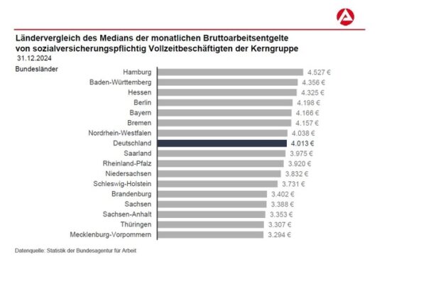 Nürnberg (ots) – – Medianentgelte stiegen im Jahr 2024 auf monatlich 4.013 Euro – Gender-Pay-Gap…