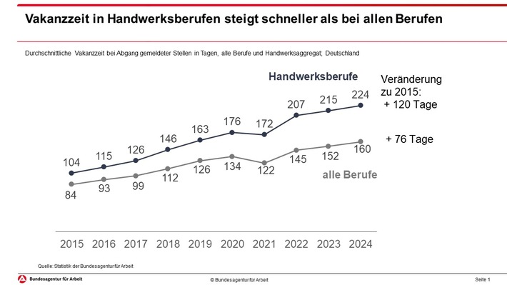 Daten der Bundesagentur für Arbeit (BA) belegen, dass es für Betriebe immer herausfordernder wird, eine offene Stelle für einen Handwerksberuf zu besetzen. Die Dauer vom frühestmöglichen Besetzungszeitpunkt bis zur Abmeldung einer offenen Stelle bei Arbeitsagenturen und Jobcentern (durchschnittliche abgeschlossene Vakanzzeit) zeigt dies deutlich. Sie stieg für Stellen im Handwerk von 104 Tagen im Jahr 2015 auf 224 Tage im Jahr 2024. Zum Vergleich: Die Vakanzzeit aller gemeldetem Stellen stieg im selben Zeitraum von 84 auf 160 Tage. Sie ist damit in zehn Jahren um 120 Tage gestiegen, während der Anstieg bei allen Stellen nur 86 Tage beträgt. Die Betriebe mit Handwerksberufen brauchen also nicht nur länger bei der Stellenbesetzung, der Anstieg der Vakanzzeit ist außerdem größer als bei allen Berufen insgesamt. Dabei sind die Fachkräfteengpässe in Handwerksberufen groß. Allein 40 Berufe auf Fachkräfteniveau, die typischerweise im Handwerk ausgeübt werden, sind aktuell von einem Fachkräfteengpass betroffen. Die Besetzungsprobleme stehen also auch im Zusammenhang mit dem Fachkräftemangel.